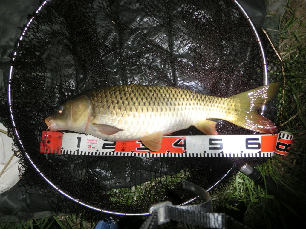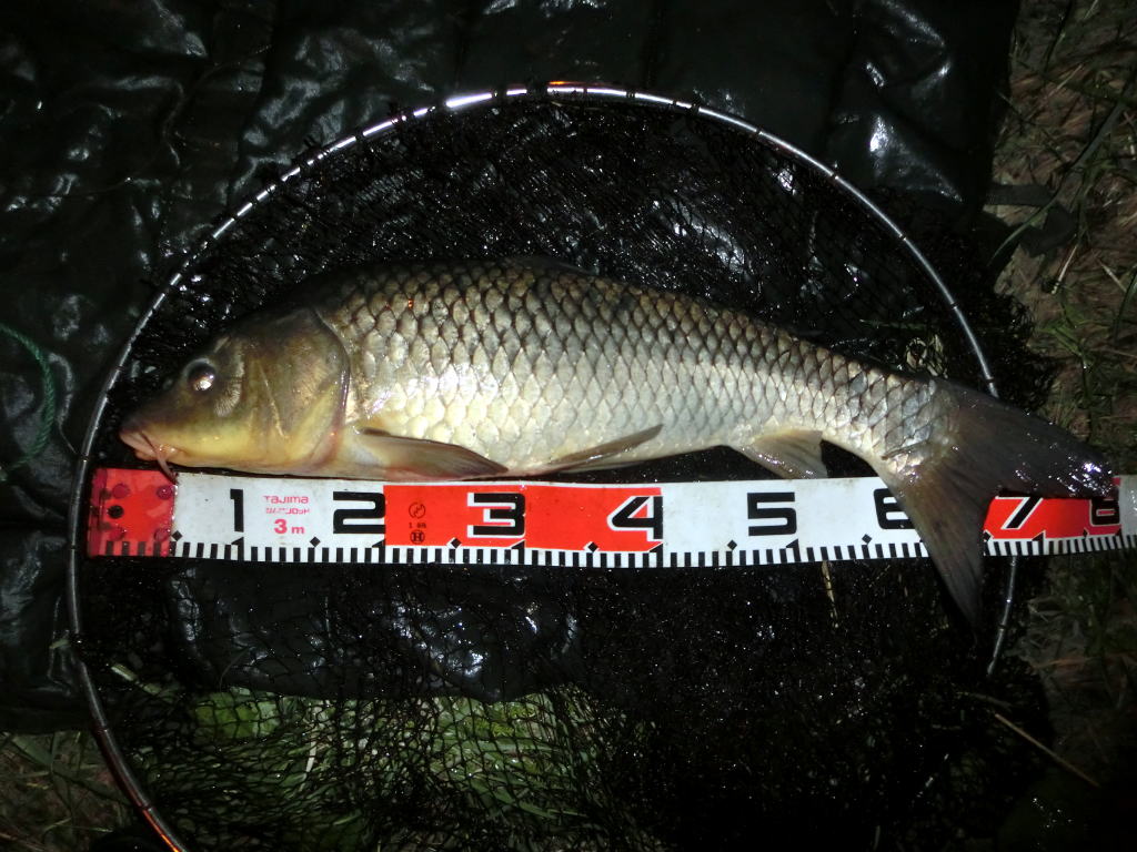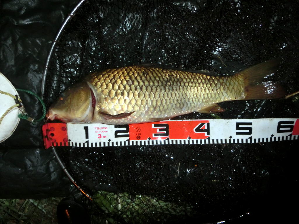 20時30分。今は上げ四分といった潮具合だ。そして23時頃に満潮になる。早朝までに次のアタリを取れなければ作戦を変更しようかと考えていた矢先に二番竿のアラームが走るようにして鳴り出した。しかし、いくら急かされても痛めた足で私は走れない。土手を降りながらヘッドライトで竿を照らすと、二番竿が左へ大きく曲がりながらスプールを滑らせていた。今度の鯉はやる気がありそうだ。ここは疾走する鯉は少なくても、足場がとぎれ、その先にブッシュがある左に行かれるとやっかいだ。減水しているので川に立ち込める。深みになる手前、長靴が浸かりきらないように立ち込んで底のブロックに靴底をグリップさせる。竿を大きく右に向け、魚をこちらに向かせてハンドルを回す。一匹目よりはマシな程度の鯉だが、首振りは強い。やがて私のライトに照らされて光る鯉を捕捉しネットイン。65cm程だが完璧なフッキングが出来ていることが喜ばしい。