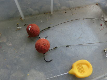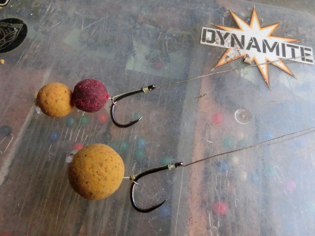 パイナップルは15mm、20mmがあり、二本の竿で両方とも使ってみたい。寄せエサをベイトロケットで三発打ち込んだら、次に仕掛けをボックスから取り出す。仕掛けは相変わらずのブローバックリグだが、針は去年まで使ってきた伊勢尼針14号から15号と大きいものを使う。ハリスのヘアも去年より少し長くして、ボイリーから針のベントまでの間隔を若干広くする。これまでは小さなエサを意識した鯉、または警戒心の強い鯉が最小限の力でエサを吸い込もうとする 「キッシングバイト」 により、ボイリーだけが口の奥に入り、針は口内の浅い部分にしか入らないということを危惧してヘアを短めに、ボイリーと針の間隔を狭めにしてきたが、それによってボイリーが針のフッキングの妨げになる事も考えられた。その点を踏まえ、今年からはボイリーと針までの間隔を数mm広く取ることにした。