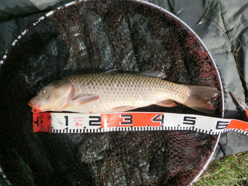 17時。一番竿のアラームが短く鳴って止んだ。ウグイか?それにしては連発しない。懐疑的になるようなアラームの鳴らし方。空アタリか?釣り場へ降りると青のスウィンガーが送信機のところまで上がりきって止まっている。ウグイならここまでスウィンガーを上げることはない。訝しの眼差しで竿を見つめて1分経ったところで竿が引き込まれた。小さいんだ。そして魚は焦りを見せていない。ラインの先にいるのが鯉であることが分かる程度で引きもしない。これはタモ入れ前後にようやく自分のおかれた状況を理解して大暴れするタイプだ。そして案の定、大きさも行動も私の思ったとおりの鯉がタモに収まった。50cmの若い小鯉。それでも今年度の初鯉だ。喜ばしいではないか。